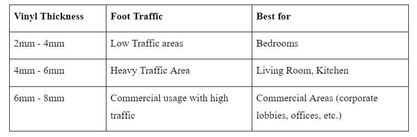 Vinyl flooring thickness for various applications.